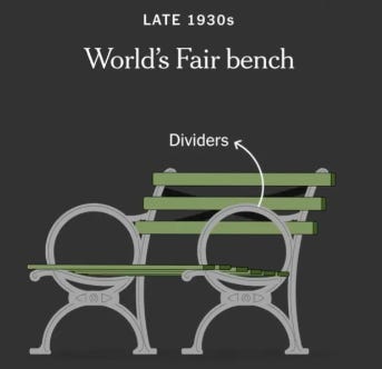Le panchine della città sono più di un servizio per chi ha bisogno di riposo. La loro conformazione ci fa intuire quanto le politiche del posto siano più o meno ostili alla parte della popolazione ritenuta meno produttiva (leggi: persone senza fissa dimora, persone in pensione o disoccupazione, giovani). Dalla newsletter di